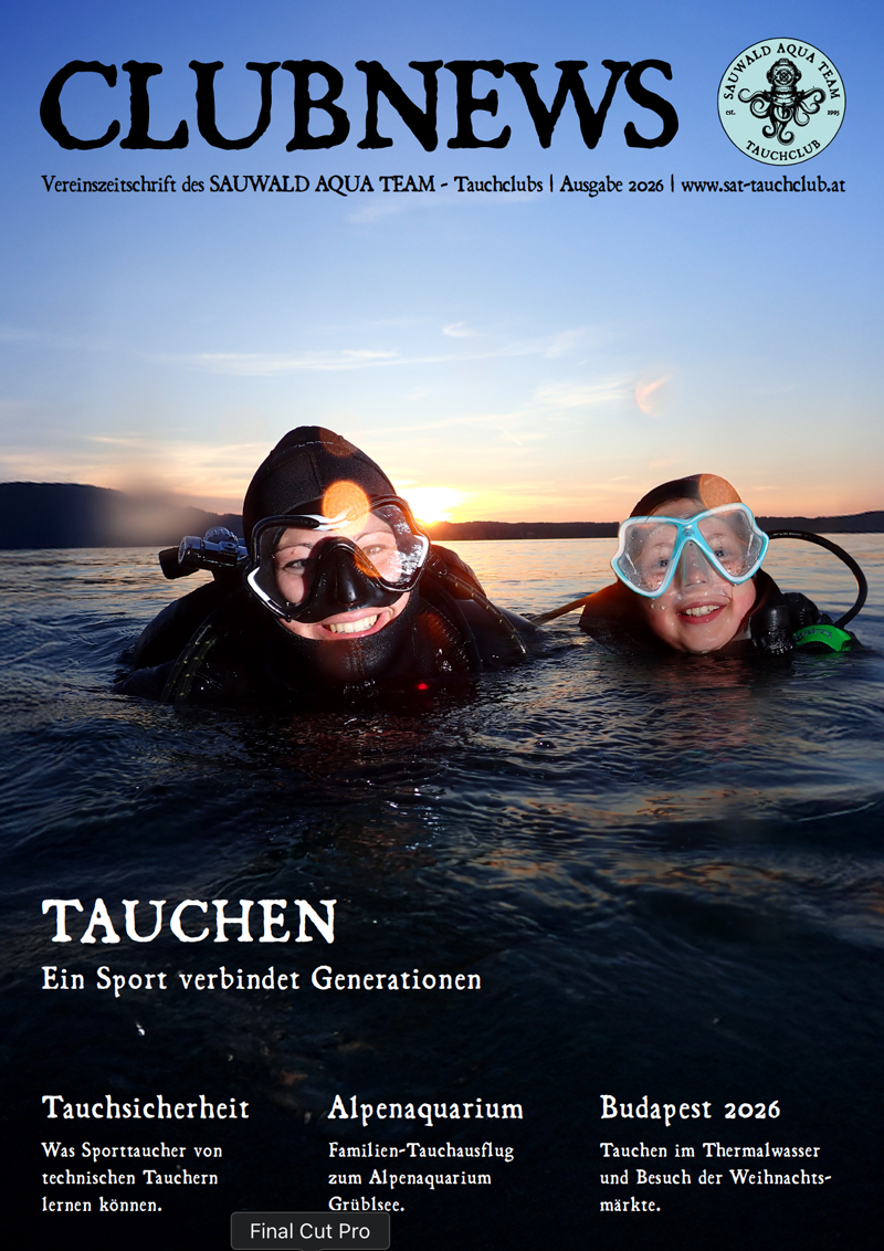 In unserer aktuellen Vereinszeitschrift blicken wir auf ein abwechslungsreiches Jahr im SAUWALD AQUA TEAM – Tauchclub zurück. Das Magazin bietet Einblicke in gemeinsame Tauchgänge im In- und Ausland, Vereinsaktivitäten, Veranstaltungen sowie persönliche Berichte und Eindrücke unserer Mitglieder. Ergänzt wird der Inhalt durch Hintergrundberichte rund um den Tauchsport und das Vereinsleben.